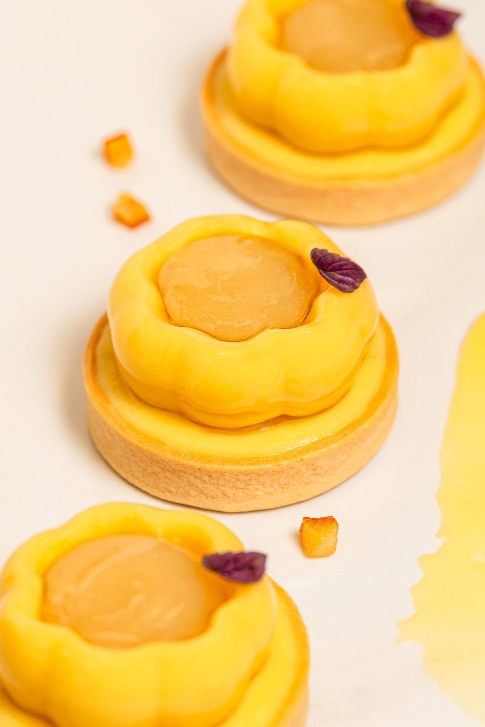 Tartaleta rellena con cremoso de mandarina, núcleo de limón y mandarina, terminado con una ganache montada de mandarina.