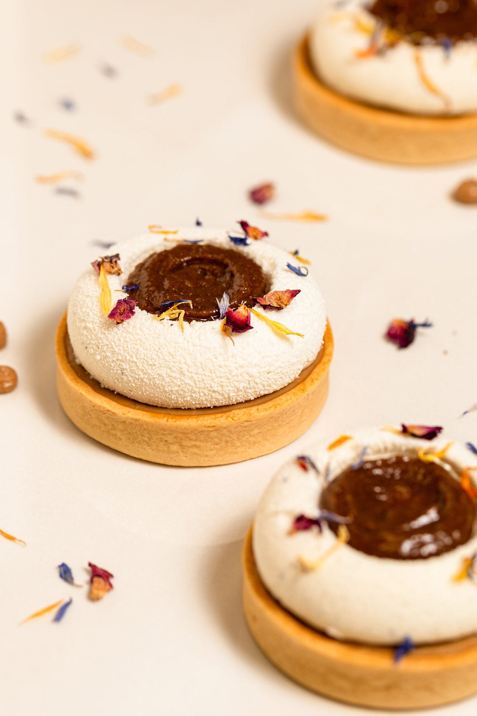 Tartaleta con base cremosa de almendra, núcleo de caramelo salado y ganache montada de chocolate blanco y
