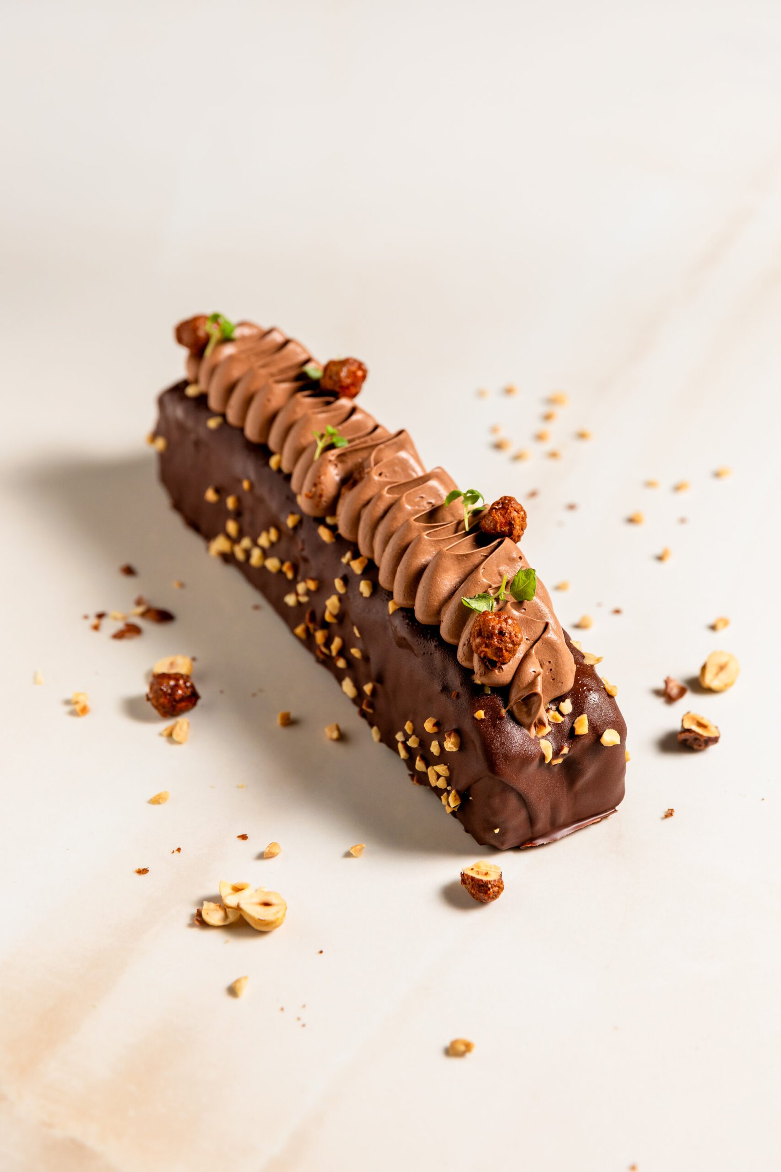baño de chocolate y cacahuete y terminado con una ganache de chocolate con leche vegetal.