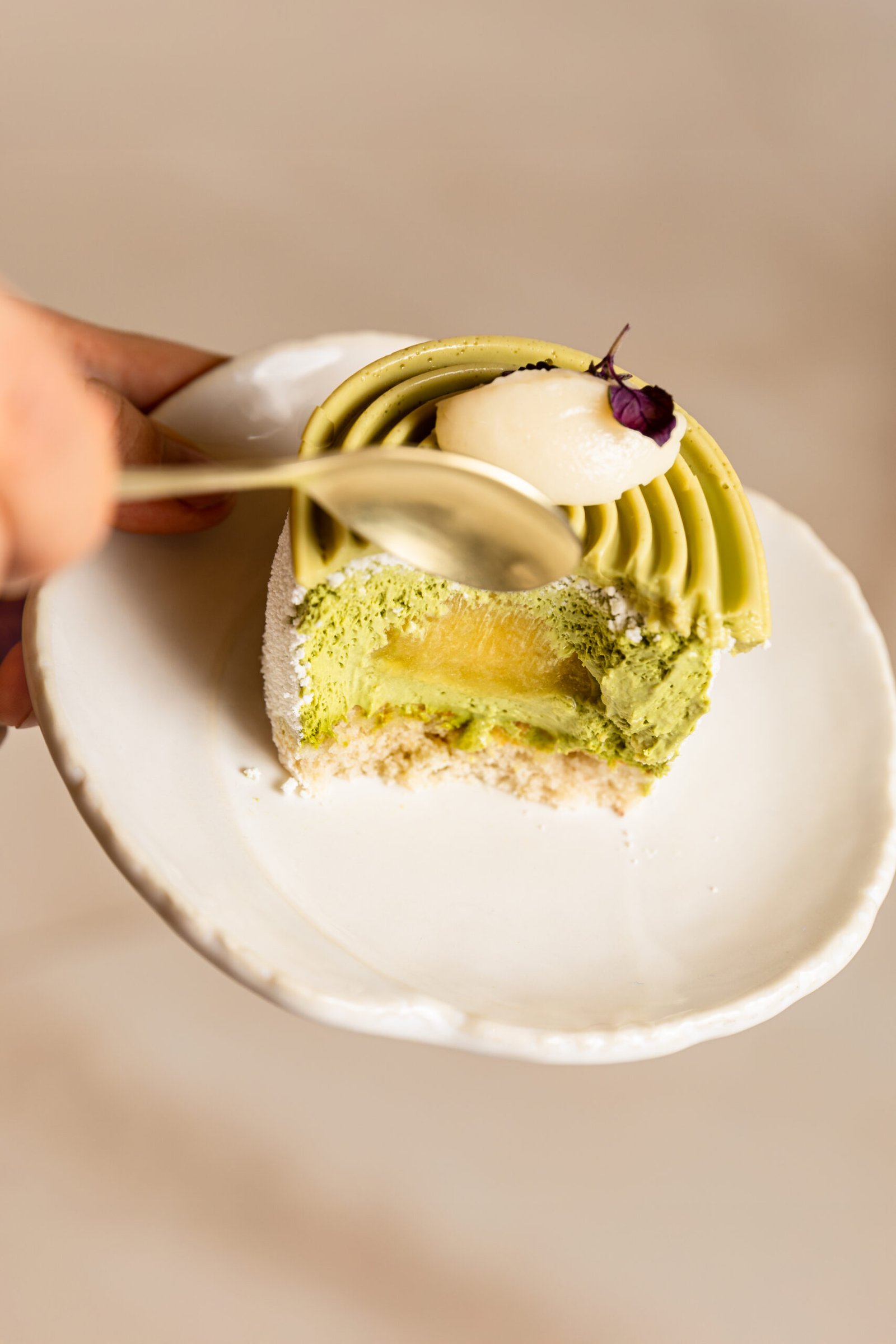 Bizcocho esponjoso de almendra, núcleo cremoso de limón y naranja, ganache montada de matcha y terminado con un