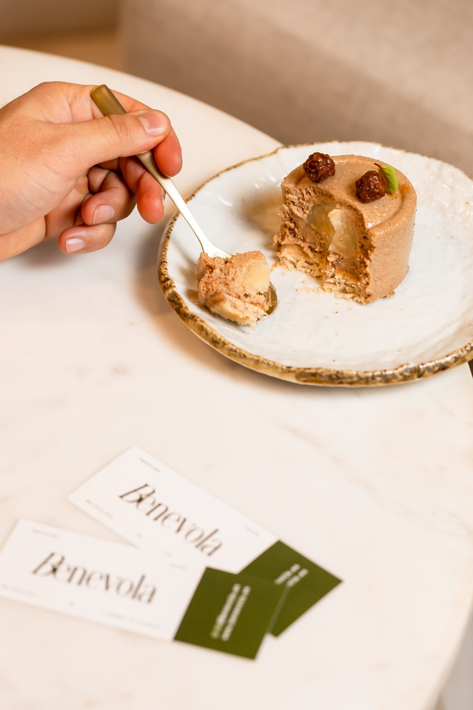 Base de bizciocho de anís, cardamomo y nuez moscada, núcleo cremoso de lima y mousse de avellana, coronado