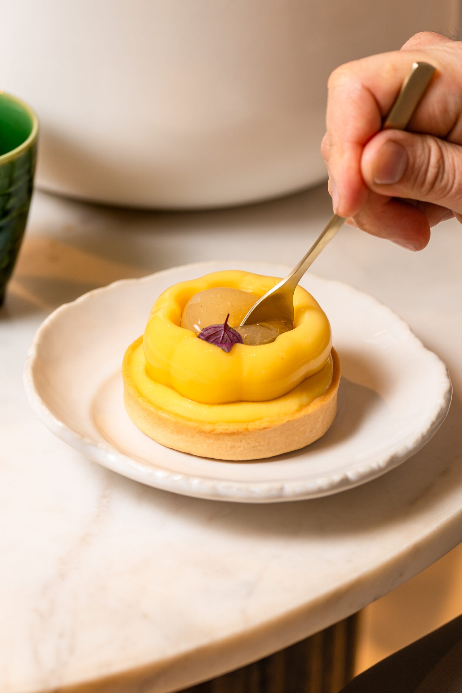Tartaleta rellena con cremoso de mandarina, núcleo de limón y mandarina, terminado con una ganache montada de mandarina.